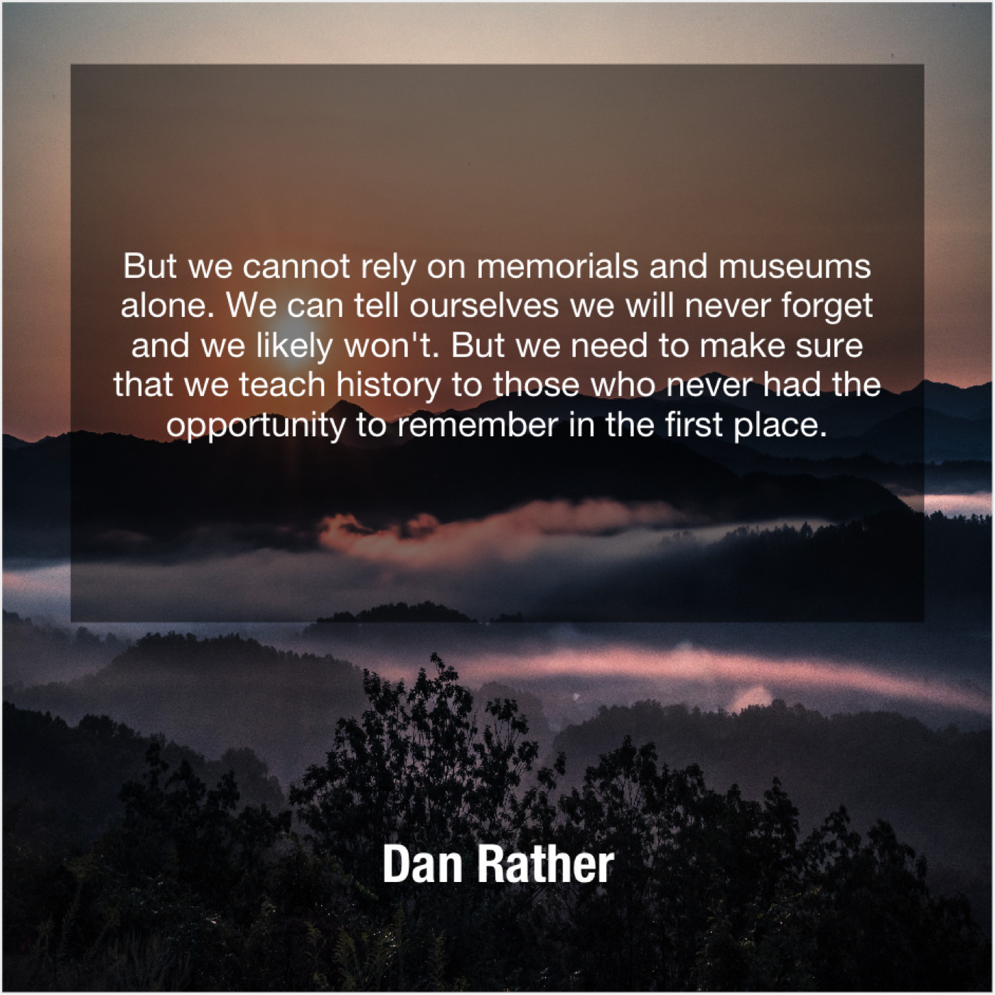 Dan Rather Dan Rather – But we cannot rely on… December 29, 2018 admin “But we cannot rely on memorials and museums alone. We can tell ourselves we will never forget and we likely won’t. But we need to make sure that we teach history to those who never had the opportunity to remember in the first place.”-Dan Rather