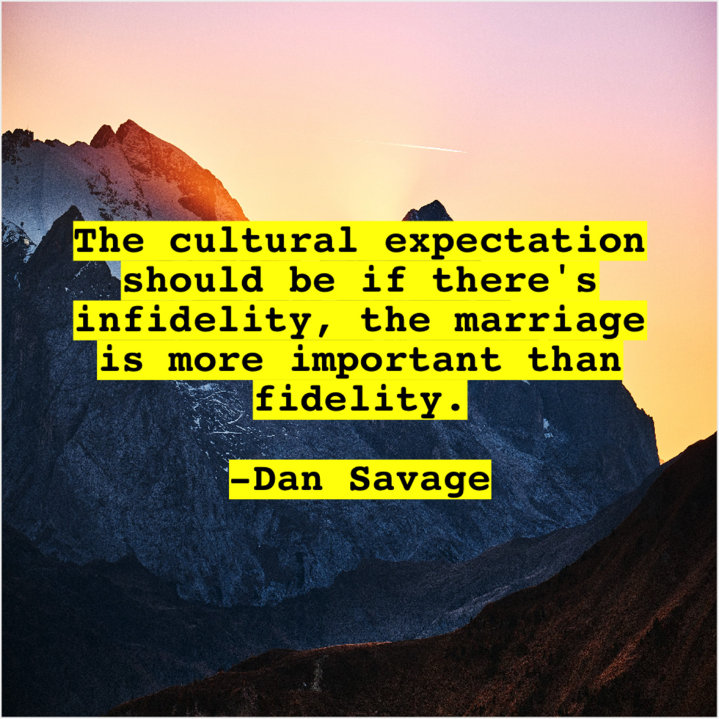 Dan Savage Dan Savage – The cultural expectation should be… January 22, 2019 admin “The cultural expectation should be if there’s infidelity, the marriage is more important than fidelity.”-Dan Savage