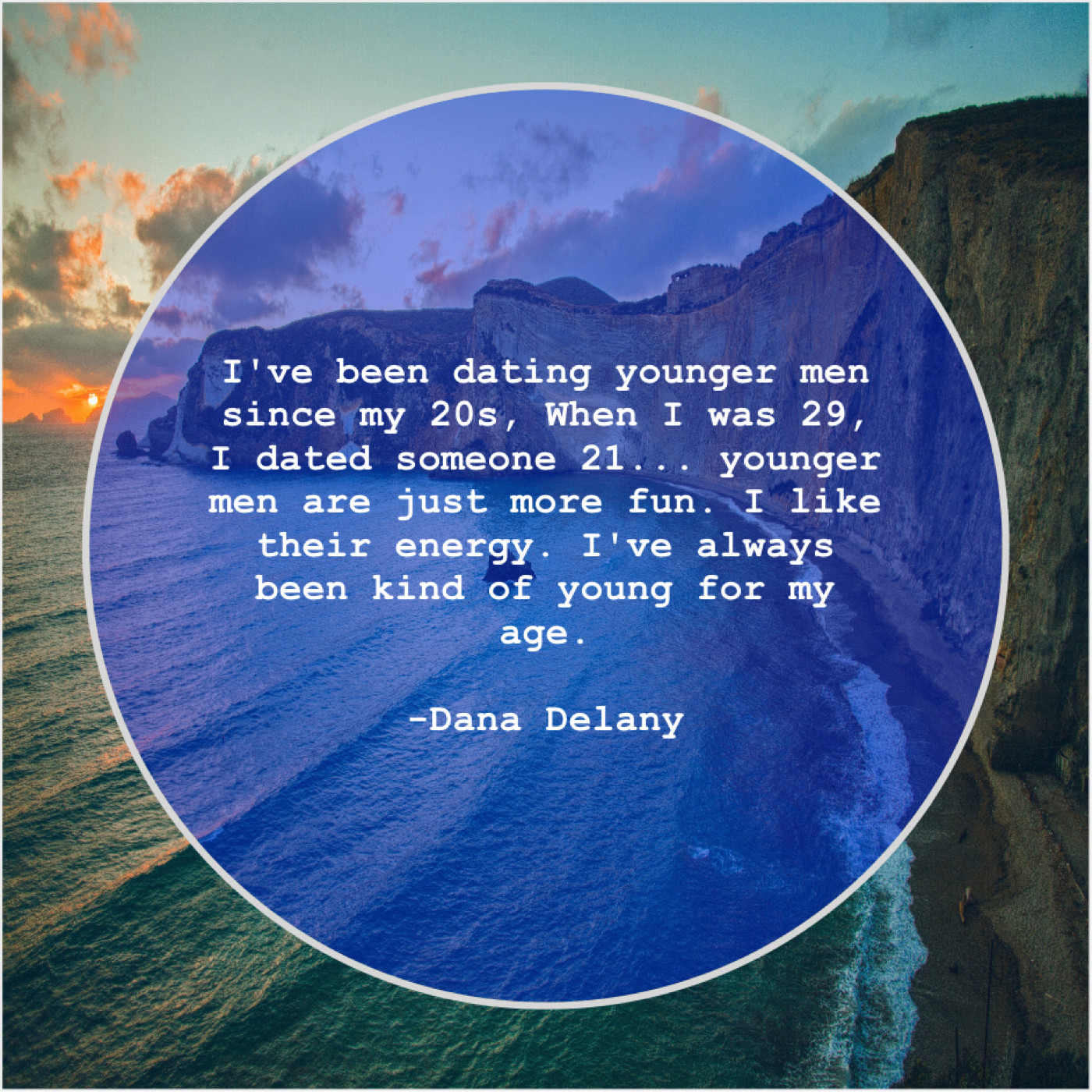 Dana Delany Dana Delany – I’ve been dating younger men… April 23, 2019 admin “I’ve been dating younger men since my 20s, When I was 29, I dated someone 21… younger men are just more fun. I like their energy. I’ve always been kind of young for my age.”-Dana Delany