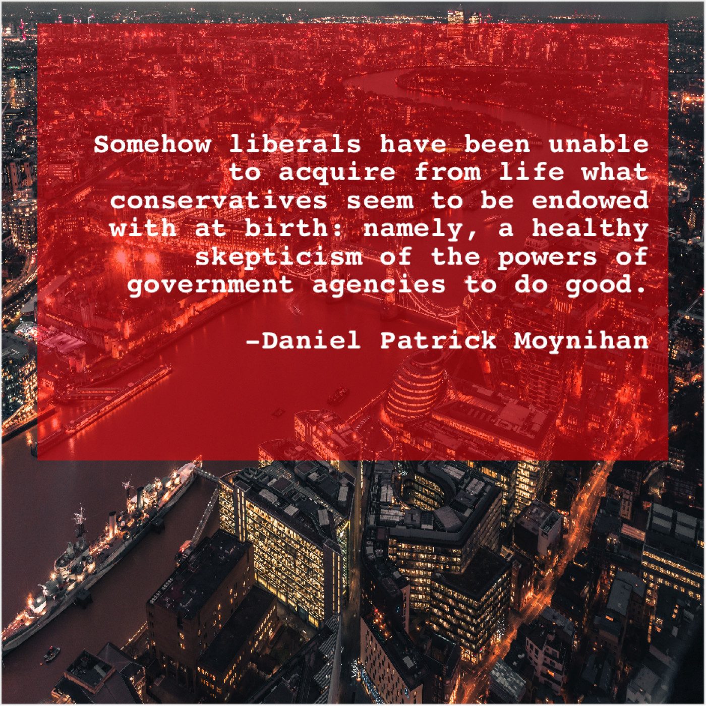 Daniel Patrick Moynihan Daniel Patrick Moynihan – Somehow liberals have been unable… December 24, 2018 admin “Somehow liberals have been unable to acquire from life what conservatives seem to be endowed with at birth: namely, a healthy skepticism of the powers of government agencies to do good.”-Daniel Patrick Moynihan