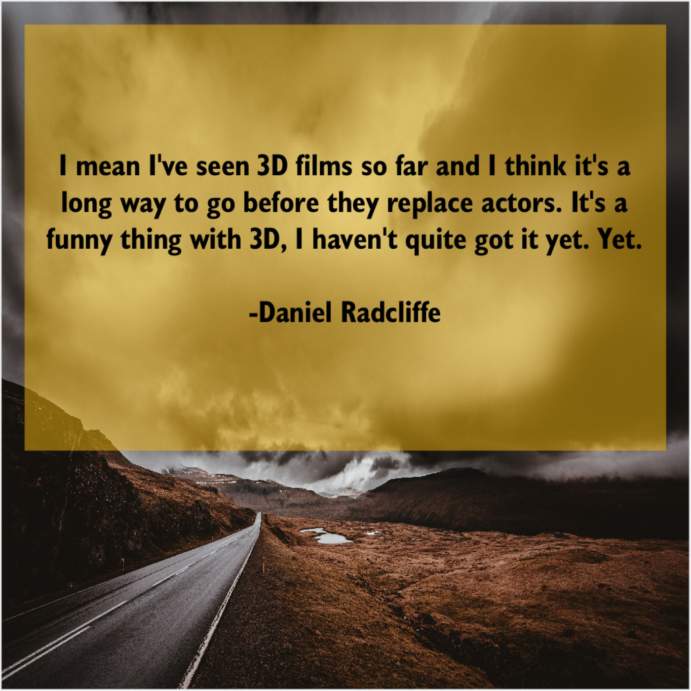 Daniel Radcliffe Daniel Radcliffe – I mean I’ve seen 3D… April 28, 2019 admin “I mean I’ve seen 3D films so far and I think it’s a long way to go before they replace actors. It’s a funny thing with 3D, I haven’t quite got it yet. Yet.”-Daniel Radcliffe