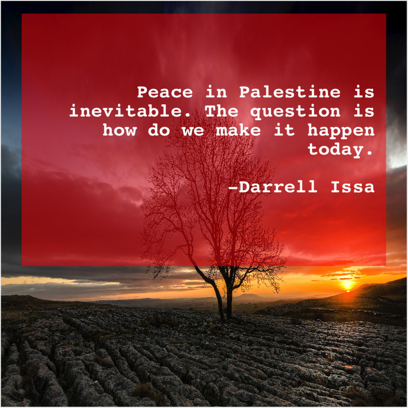 Darrell Issa Darrell Issa – Peace in Palestine is inevitable… July 20, 2019 admin “Peace in Palestine is inevitable. The question is how do we make it happen today.”-Darrell Issa