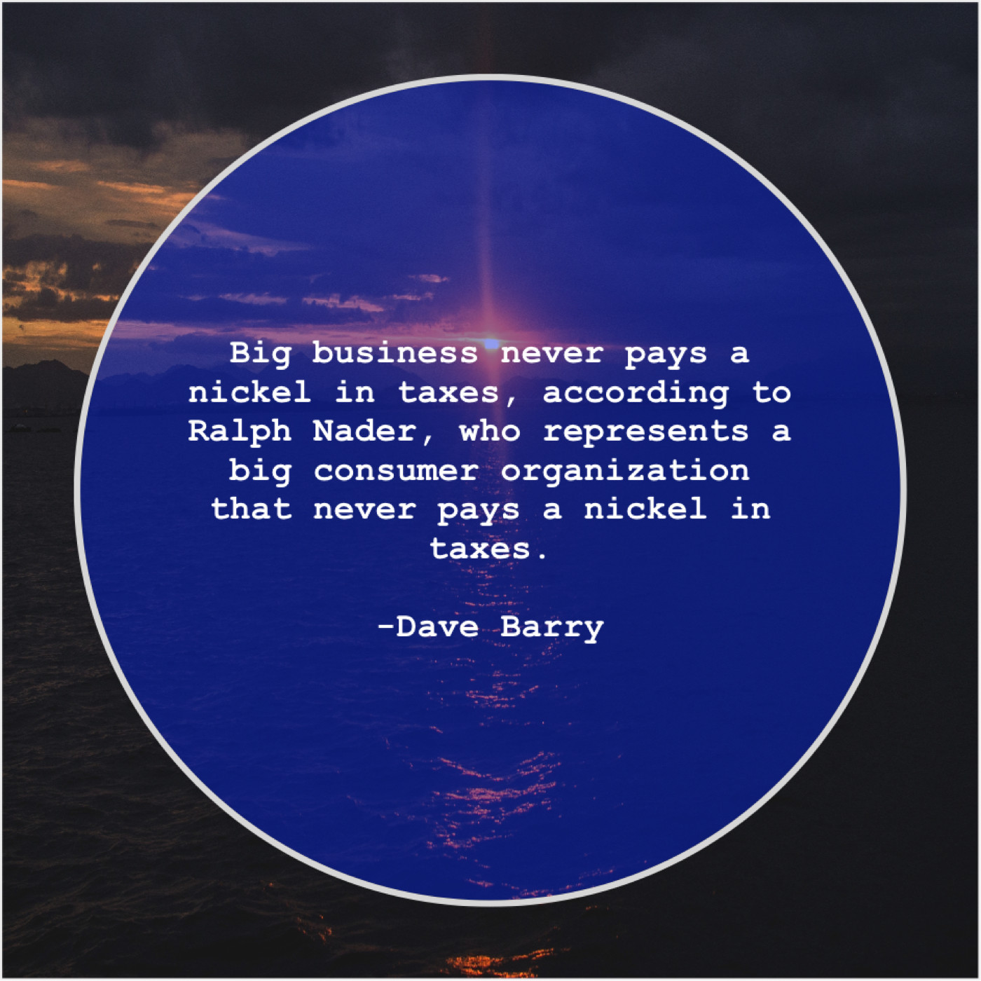 Dave Barry Dave Barry – Big business never pays a… July 26, 2019 admin “Big business never pays a nickel in taxes, according to Ralph Nader, who represents a big consumer organization that never pays a nickel in taxes.”-Dave Barry