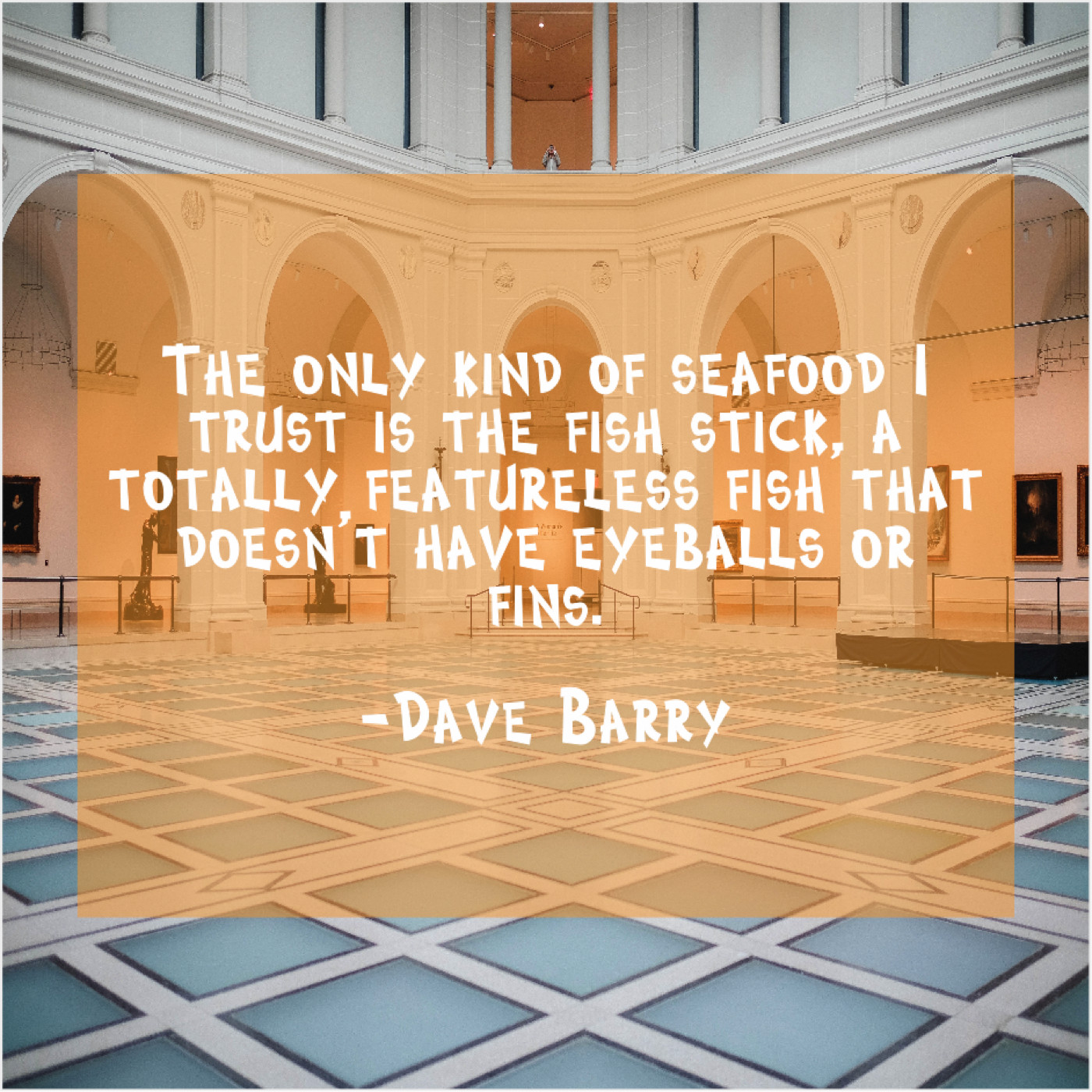 Dave Barry Dave Barry – The only kind of seafood… March 21, 2019 admin “The only kind of seafood I trust is the fish stick, a totally featureless fish that doesn’t have eyeballs or fins.”-Dave Barry