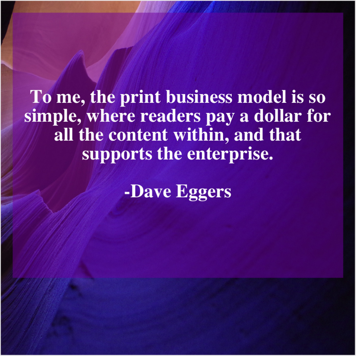Dave Eggers Dave Eggers – To me, the print business… May 29, 2019 admin “To me, the print business model is so simple, where readers pay a dollar for all the content within, and that supports the enterprise.”-Dave Eggers