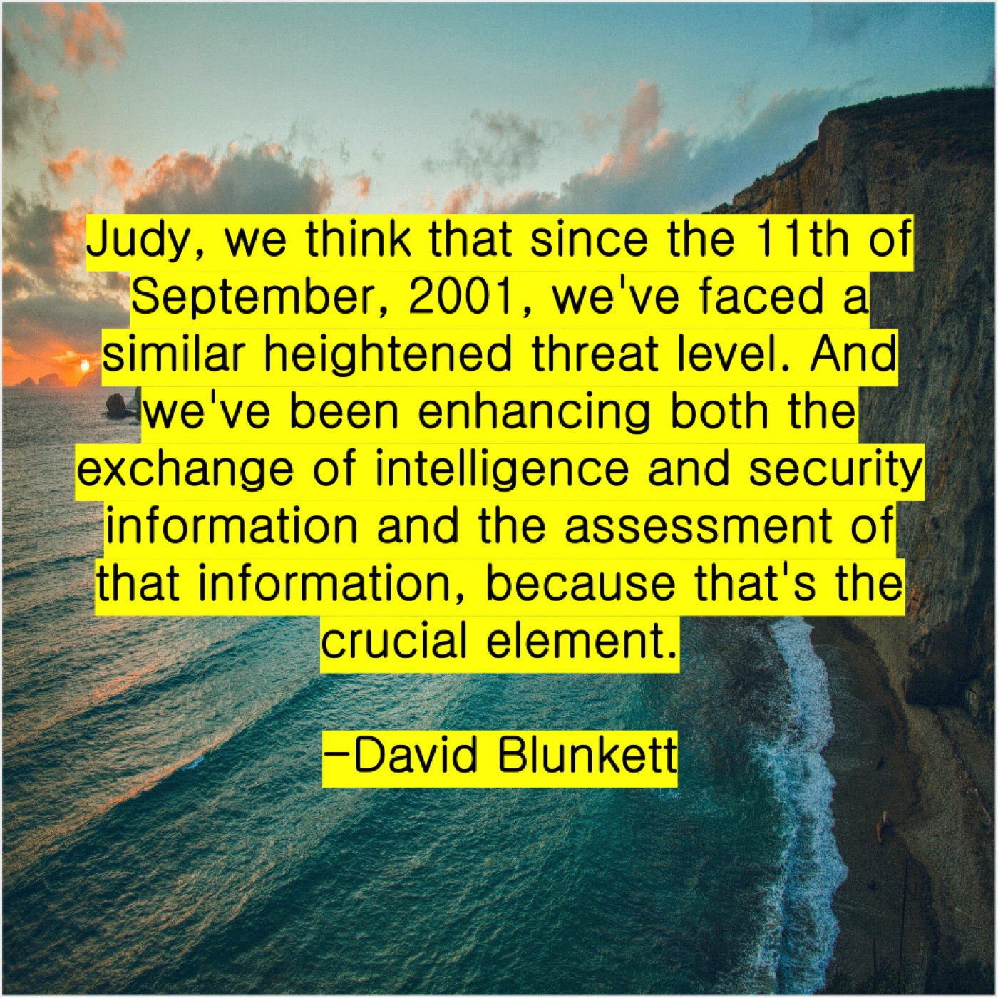 “Judy, we think that since the 11th of September, 2001, we’ve faced a similar heightened threat level. And we’ve been enhancing both the exchange of intelligence and security information and the assessment of that information, because that’s the crucial element.”