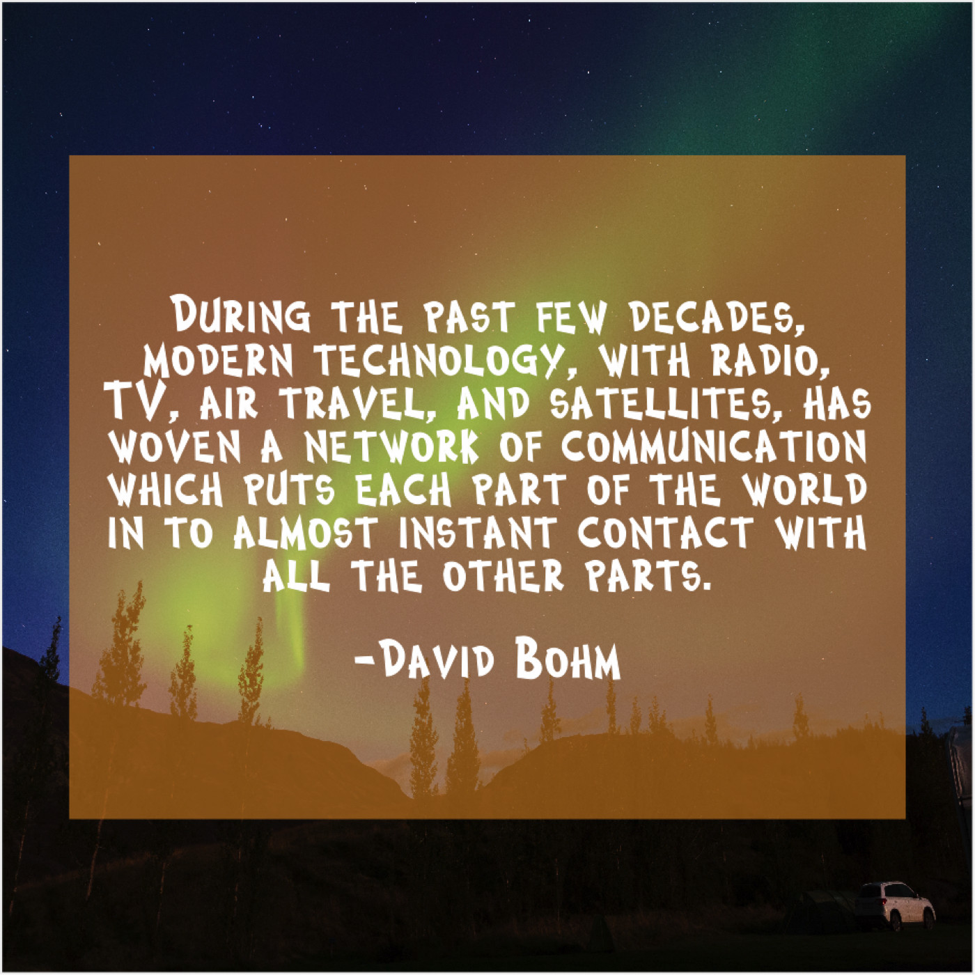 David Bohm David Bohm – During the past few decades… August 16, 2019 admin “During the past few decades, modern technology, with radio, TV, air travel, and satellites, has woven a network of communication which puts each part of the world in to almost instant contact with all the other parts.”-David Bohm
