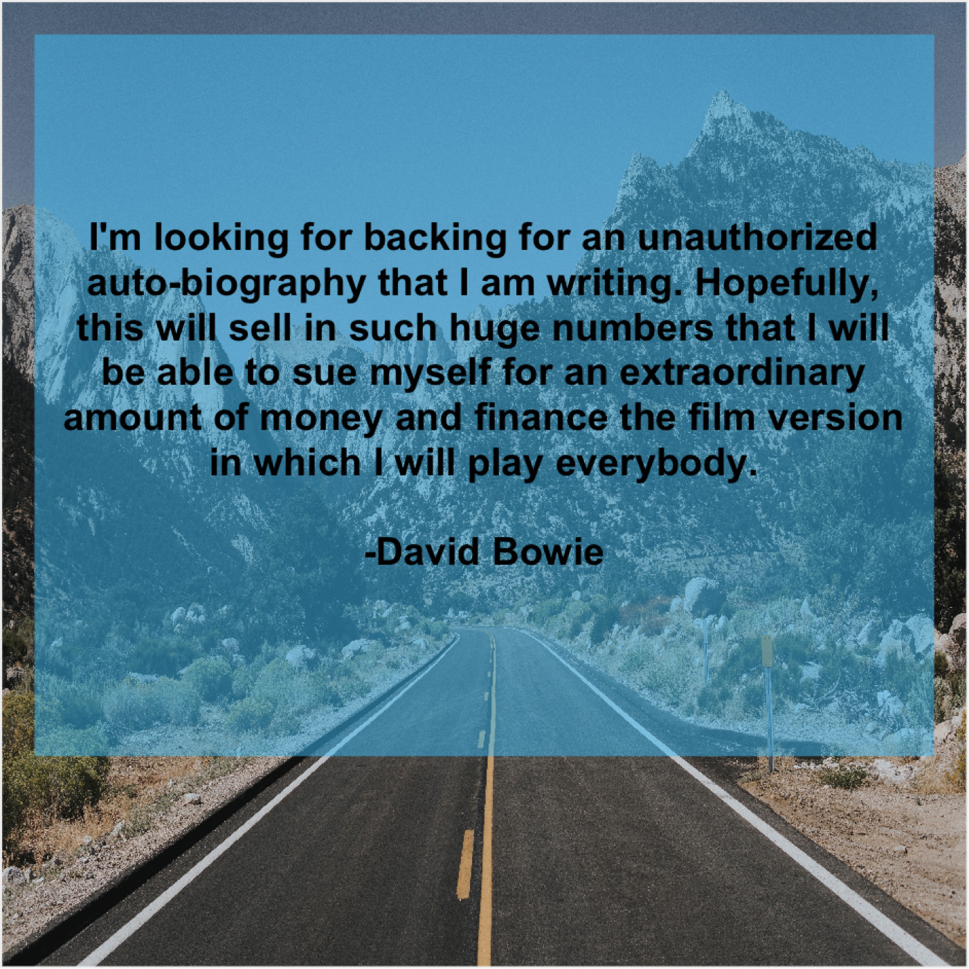 “I’m looking for backing for an unauthorized auto-biography that I am writing. Hopefully, this will sell in such huge numbers that I will be able to sue myself for an extraordinary amount of money and finance the film version in which I will play everybody.”