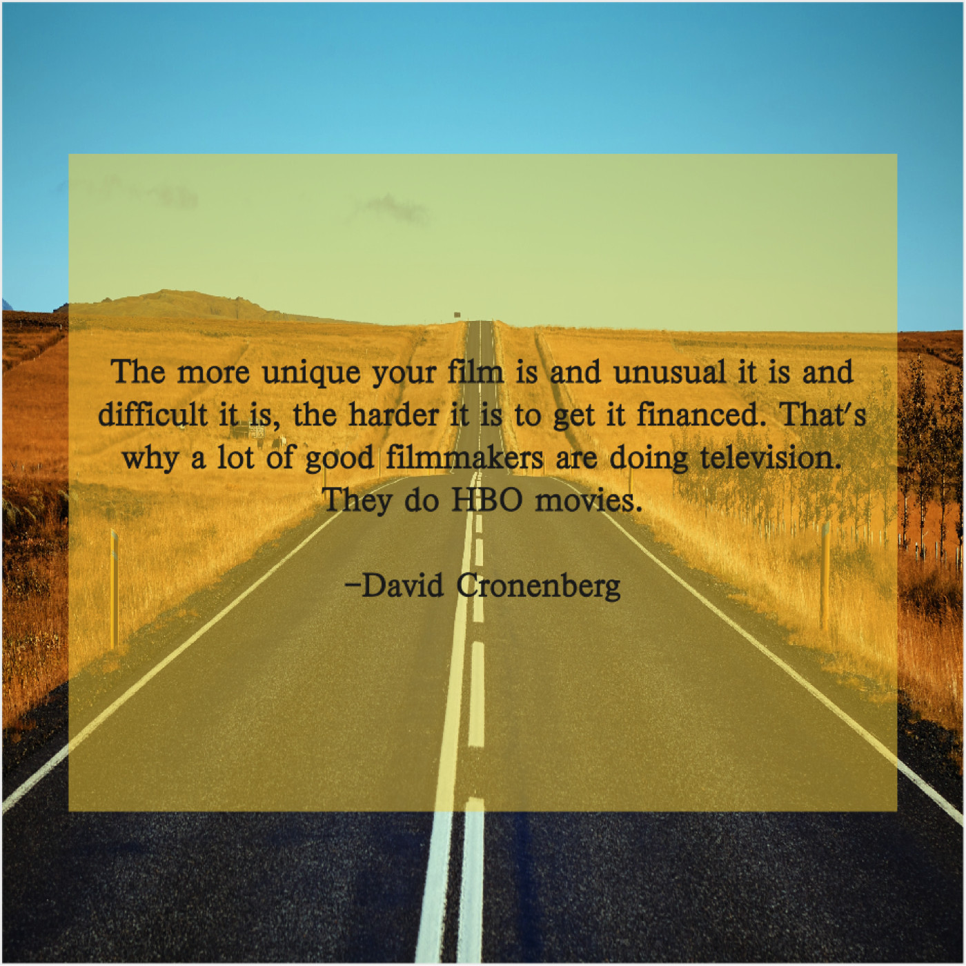 David Cronenberg David Cronenberg – The more unique your film… June 3, 2019 admin “The more unique your film is and unusual it is and difficult it is, the harder it is to get it financed. That’s why a lot of good filmmakers are doing television. They do HBO movies.”-David Cronenberg