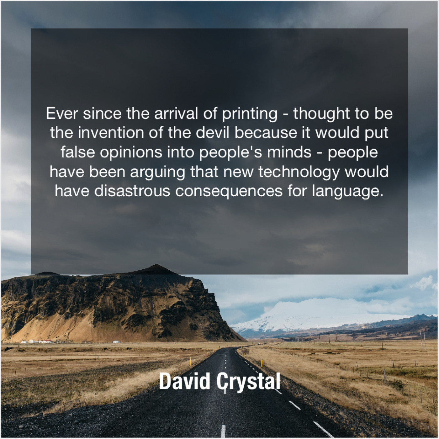 David Crystal David Crystal – Ever since the arrival of… February 12, 2019 admin “Ever since the arrival of printing – thought to be the invention of the devil because it would put false opinions into people’s minds – people have been arguing that new technology would have disastrous consequences for language.”-David Crystal