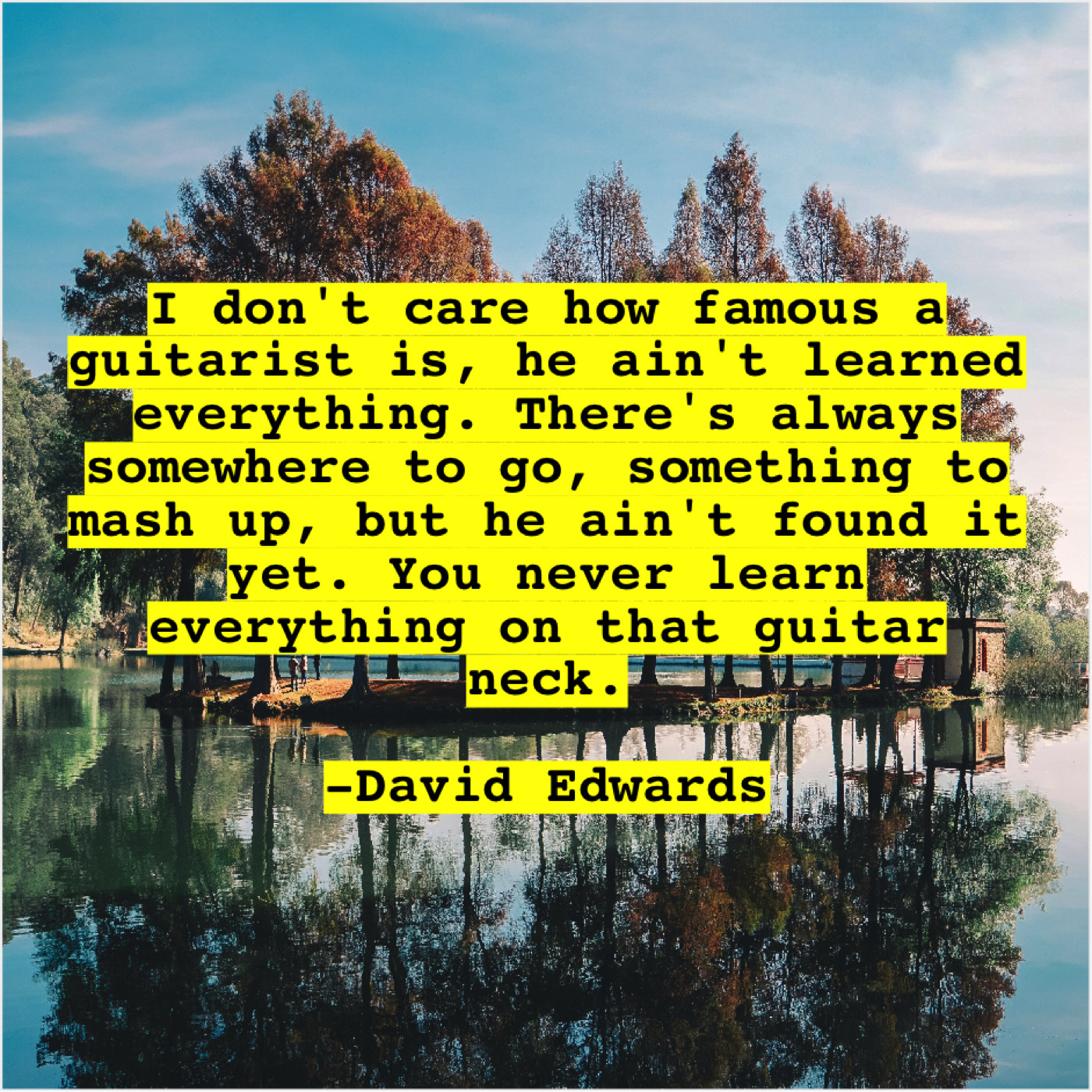 David Edwards David Edwards – I don’t care how famous… September 8, 2019 admin “I don’t care how famous a guitarist is, he ain’t learned everything. There’s always somewhere to go, something to mash up, but he ain’t found it yet. You never learn everything on that guitar neck.”-David Edwards