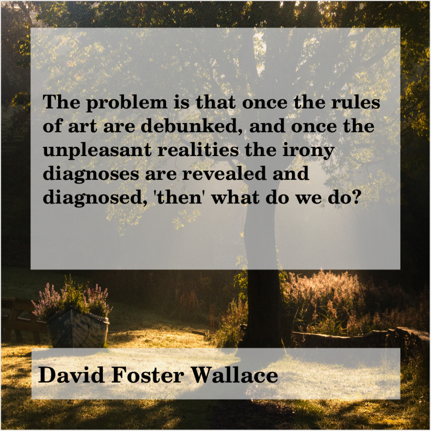 David Foster Wallace David Foster Wallace – The problem is that once… August 20, 2019 admin “The problem is that once the rules of art are debunked, and once the unpleasant realities the irony diagnoses are revealed and diagnosed, ‘then’ what do we do?”-David Foster Wallace