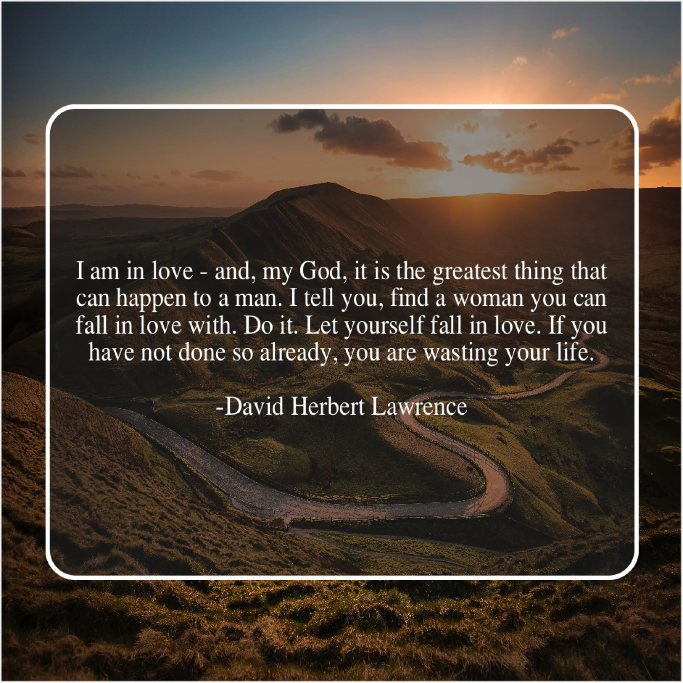 “I am in love – and, my God, it is the greatest thing that can happen to a man. I tell you, find a woman you can fall in love with. Do it. Let yourself fall in love. If you have not done so already, you are wasting your life.” -David Herbert Lawrence