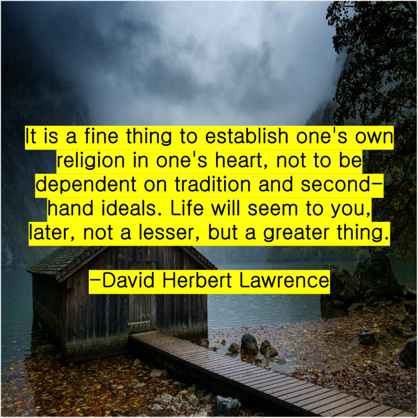 David Herbert Lawrence David Herbert Lawrence – It is a fine thing… June 9, 2019 admin “It is a fine thing to establish one’s own religion in one’s heart, not to be dependent on tradition and second-hand ideals. Life will seem to you, later, not a lesser, but a greater thing.”-David Herbert Lawrence