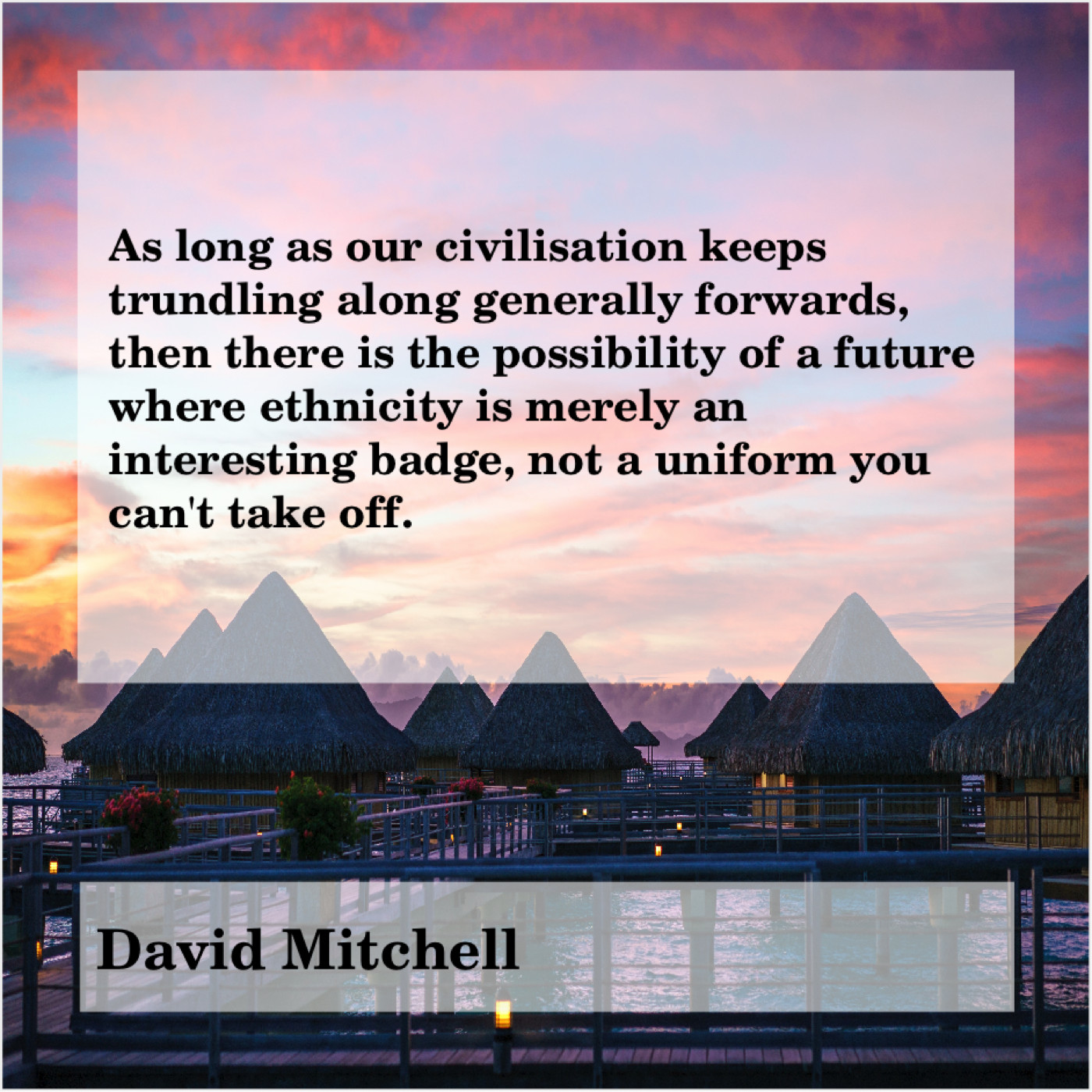 David Mitchell David Mitchell – As long as our civilisation… September 15, 2019 admin “As long as our civilisation keeps trundling along generally forwards, then there is the possibility of a future where ethnicity is merely an interesting badge, not a uniform you can’t take off.”-David Mitchell