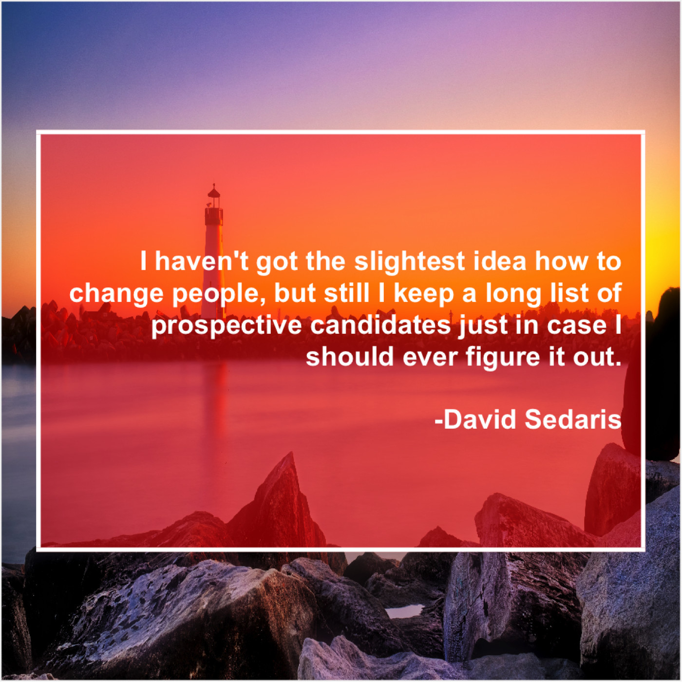 David Sedaris David Sedaris – I haven’t got the slightest… January 11, 2019 admin “I haven’t got the slightest idea how to change people, but still I keep a long list of prospective candidates just in case I should ever figure it out.”-David Sedaris