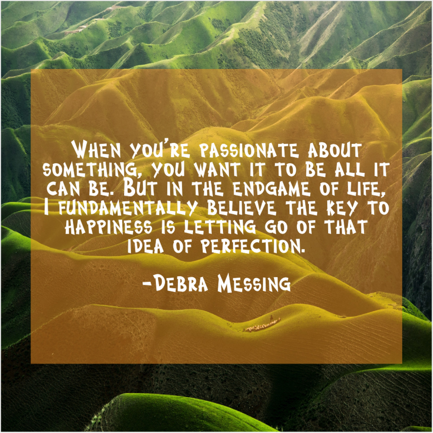 Debra Messing Debra Messing – When you’re passionate about something… July 1, 2019 admin “When you’re passionate about something, you want it to be all it can be. But in the endgame of life, I fundamentally believe the key to happiness is letting go of that idea of perfection.”-Debra Messing