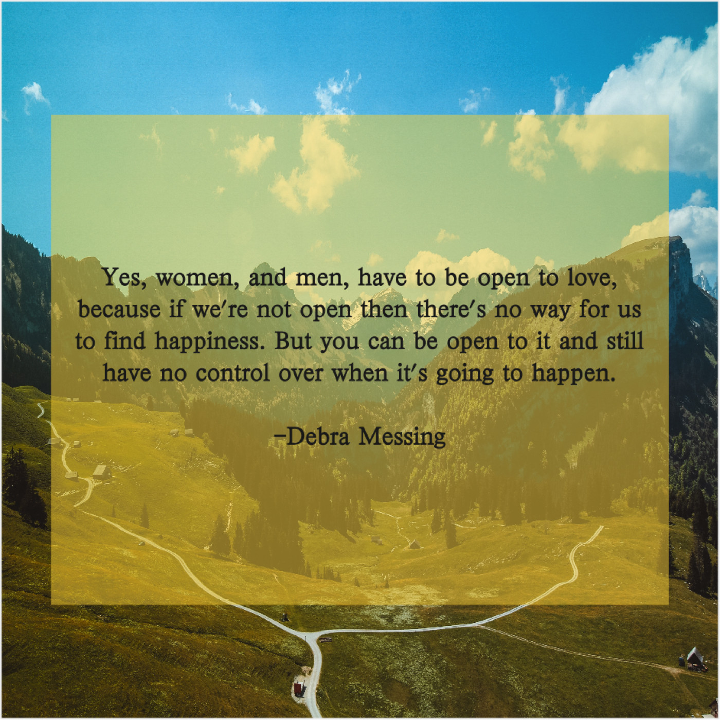 Debra Messing Debra Messing – Yes, women, and men, have… January 6, 2019 admin “Yes, women, and men, have to be open to love, because if we’re not open then there’s no way for us to find happiness. But you can be open to it and still have no control over when it’s going to happen.”-Debra Messing