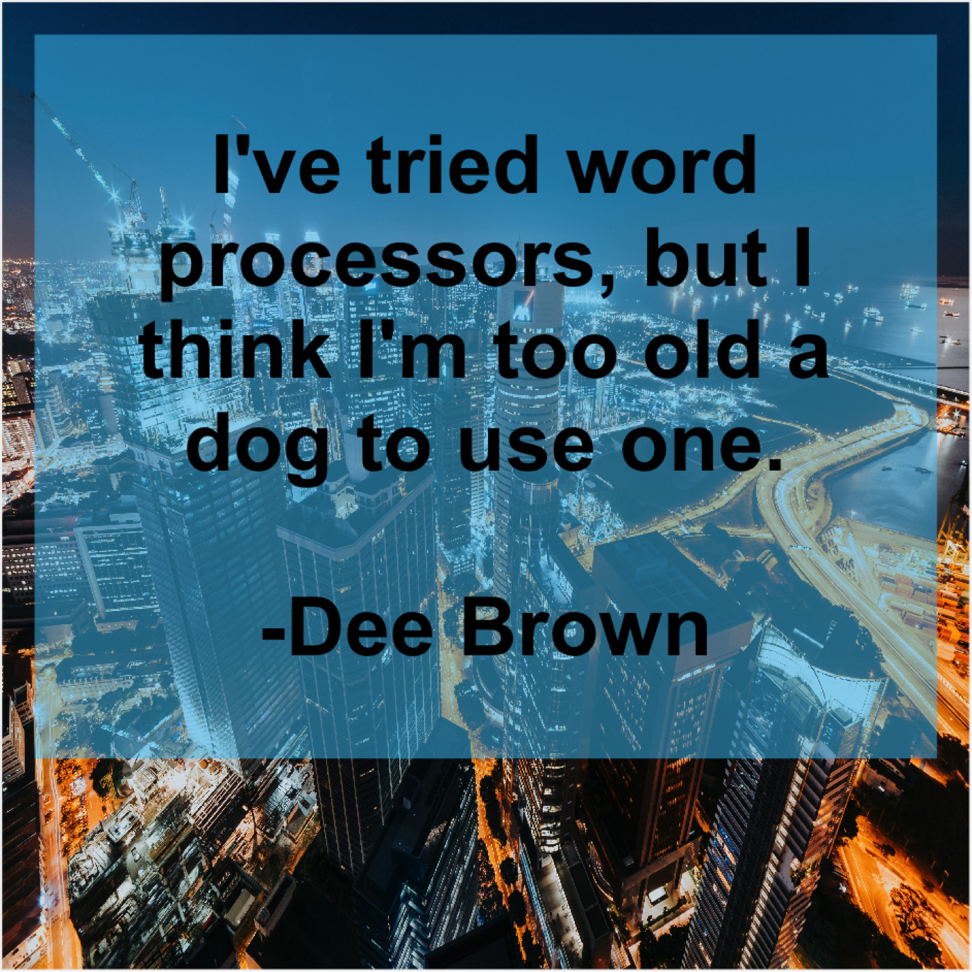 Dee Brown Dee Brown – I’ve tried word processors, but… February 18, 2019 admin “I’ve tried word processors, but I think I’m too old a dog to use one.”-Dee Brown
