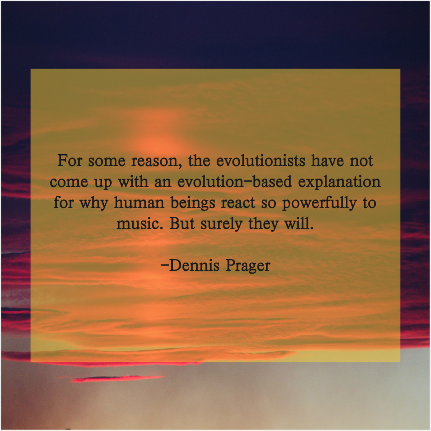 Dennis Prager Dennis Prager – For some reason, the evolutionists… May 8, 2019 admin “For some reason, the evolutionists have not come up with an evolution-based explanation for why human beings react so powerfully to music. But surely they will.”-Dennis Prager