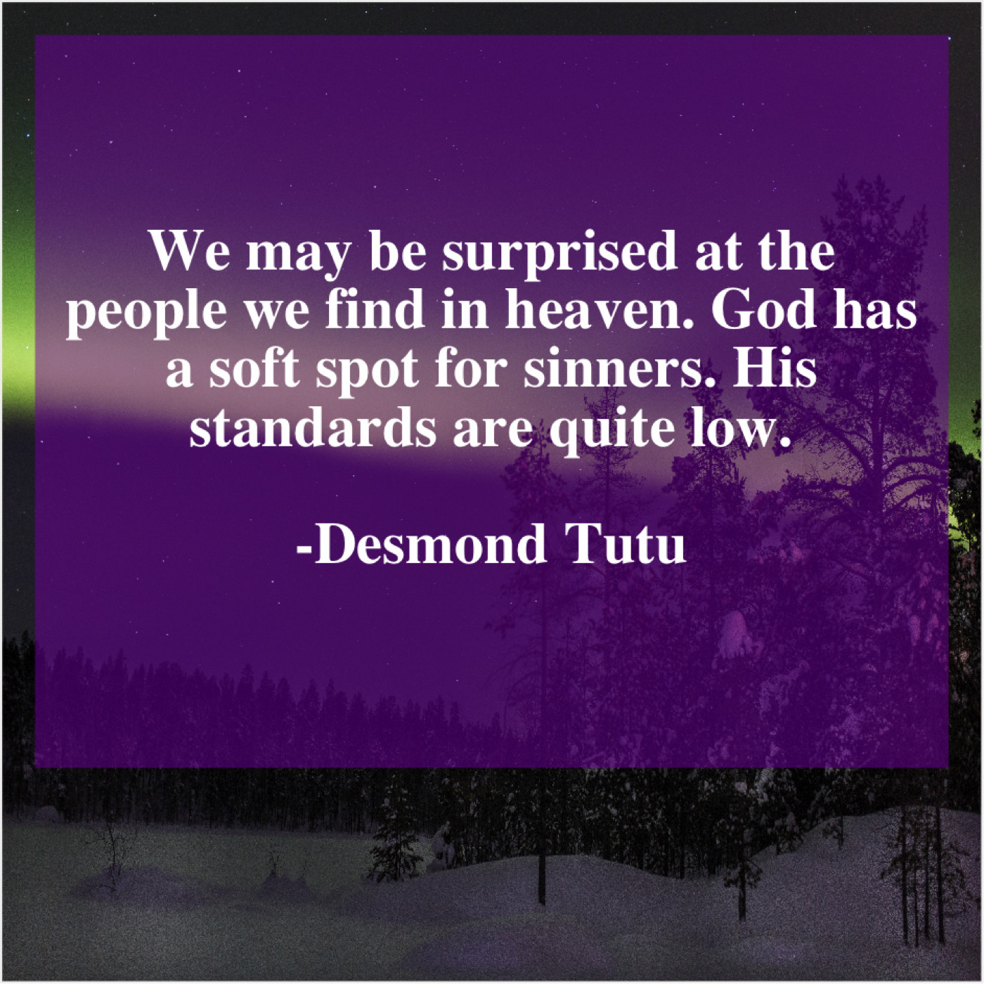 Desmond Tutu Desmond Tutu – We may be surprised at… May 13, 2019 admin “We may be surprised at the people we find in heaven. God has a soft spot for sinners. His standards are quite low.”-Desmond Tutu