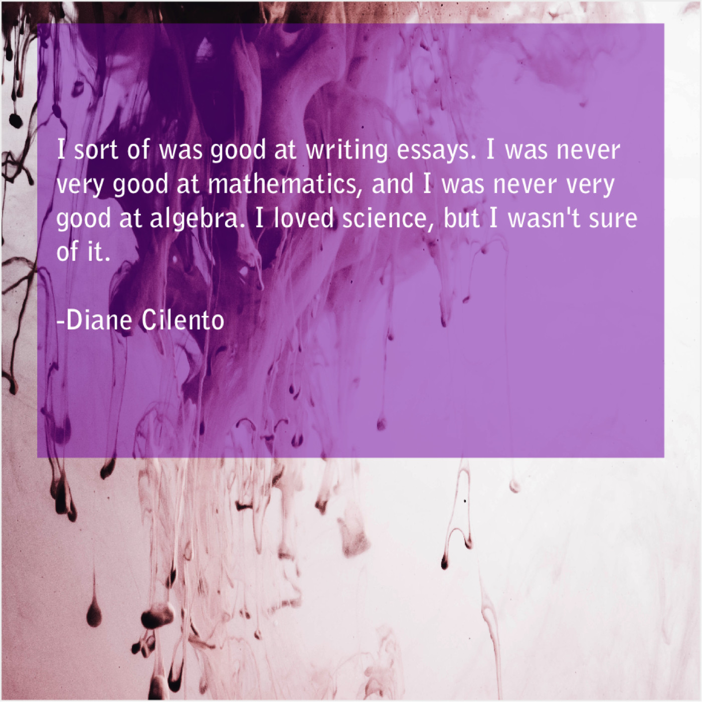 Diane Cilento Diane Cilento – I sort of was good… December 21, 2018 admin “I sort of was good at writing essays. I was never very good at mathematics, and I was never very good at algebra. I loved science, but I wasn’t sure of it.”-Diane Cilento