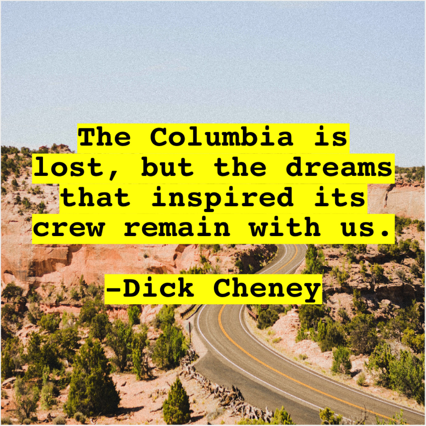 Dick Cheney Dick Cheney – The Columbia is lost, but… September 5, 2019 admin “The Columbia is lost, but the dreams that inspired its crew remain with us.”-Dick Cheney