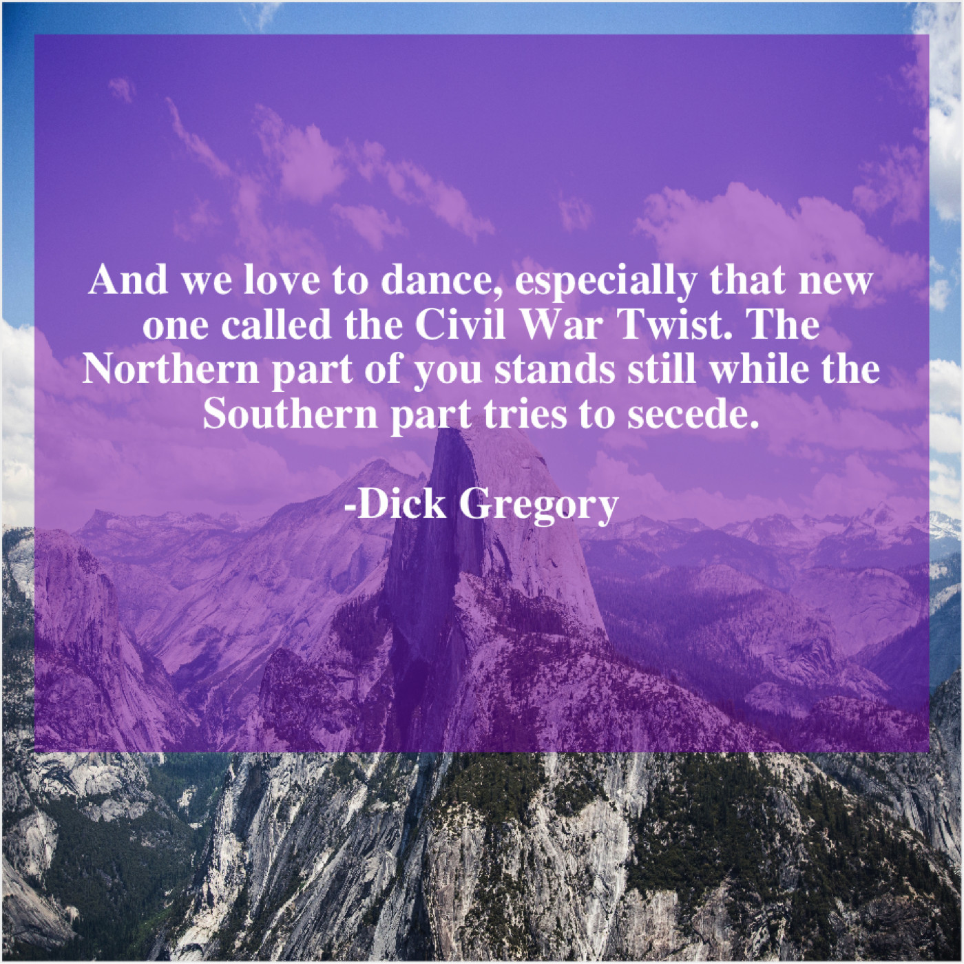 Dick Gregory Dick Gregory – And we love to dance… October 27, 2018 admin “And we love to dance, especially that new one called the Civil War Twist. The Northern part of you stands still while the Southern part tries to secede.”-Dick Gregory