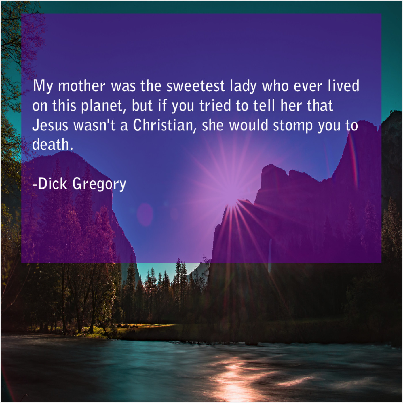 Dick Gregory Dick Gregory – My mother was the sweetest… May 24, 2019 admin “My mother was the sweetest lady who ever lived on this planet, but if you tried to tell her that Jesus wasn’t a Christian, she would stomp you to death.”-Dick Gregory