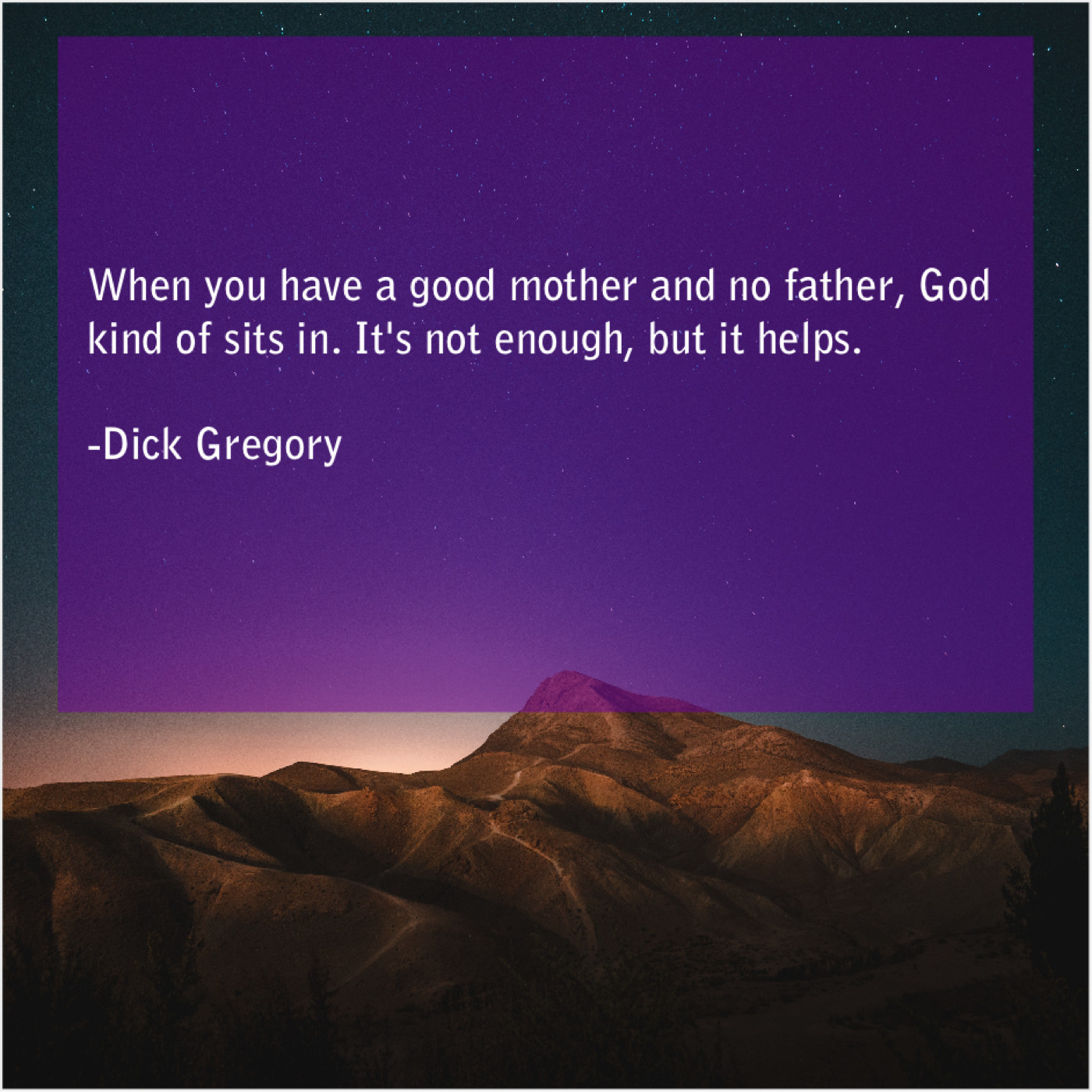Dick Gregory Dick Gregory – When you have a good… October 31, 2018 admin “When you have a good mother and no father, God kind of sits in. It’s not enough, but it helps.”-Dick Gregory