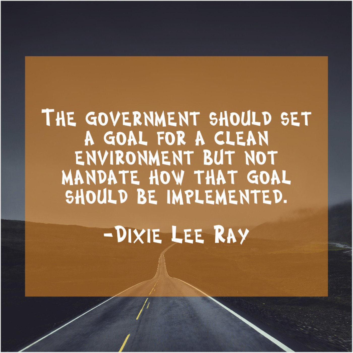 Dixie Lee Ray Dixie Lee Ray – The government should set a… August 30, 2019 admin “The government should set a goal for a clean environment but not mandate how that goal should be implemented.”-Dixie Lee Ray
