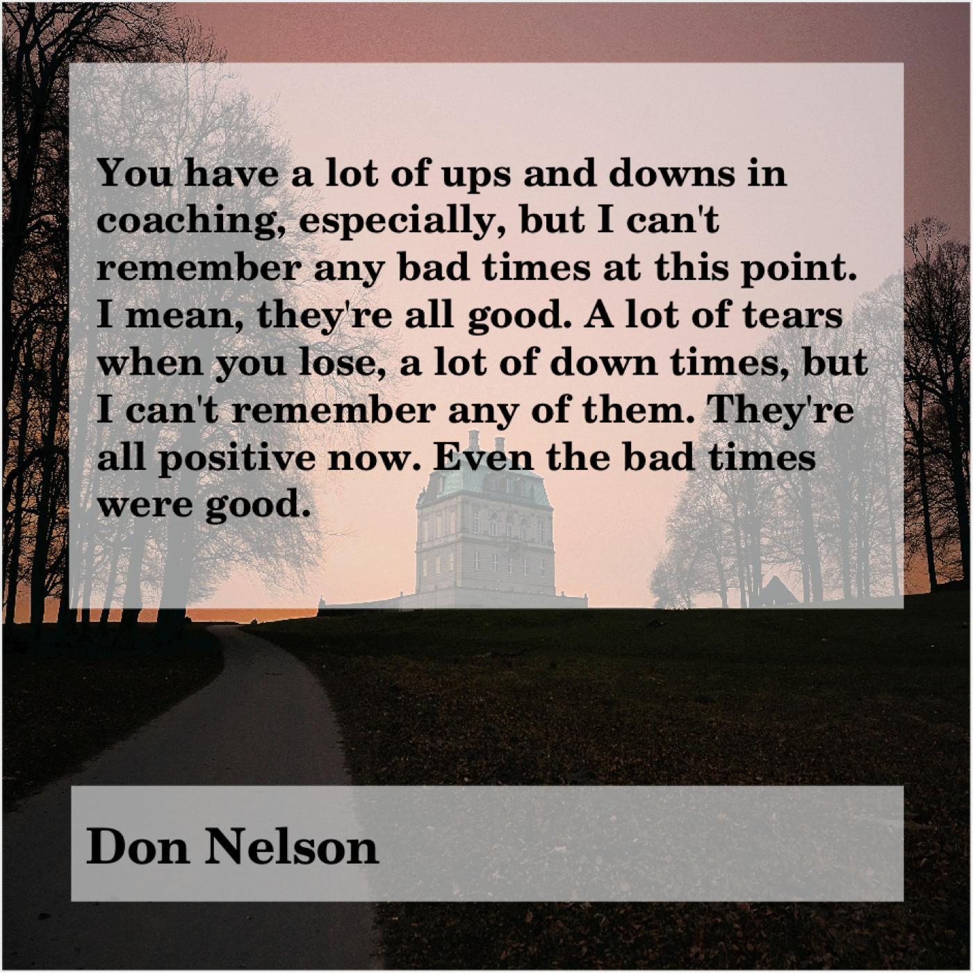 “You have a lot of ups and downs in coaching, especially, but I can’t remember any bad times at this point. I mean, they’re all good. A lot of tears when you lose, a lot of down times, but I can’t remember any of them. They’re all positive now. Even the bad times were good.”