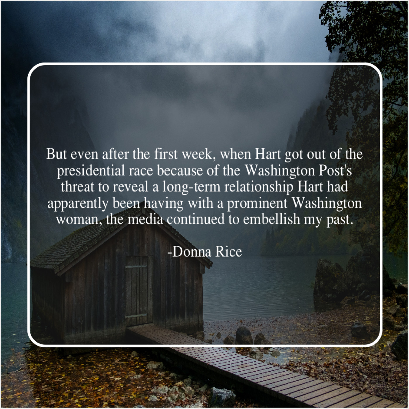 “But even after the first week, when Hart got out of the presidential race because of the Washington Post’s threat to reveal a long-term relationship Hart had apparently been having with a prominent Washington woman, the media continued to embellish my past.”