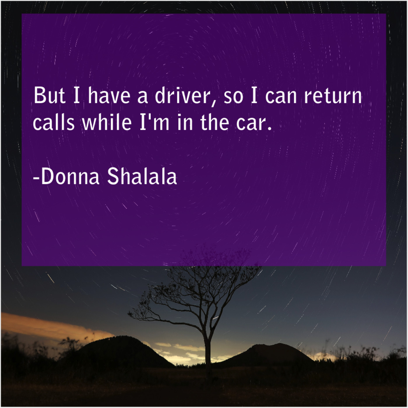 Donna Shalala Donna Shalala – But I have a driver… April 5, 2019 admin “But I have a driver, so I can return calls while I’m in the car.”-Donna Shalala