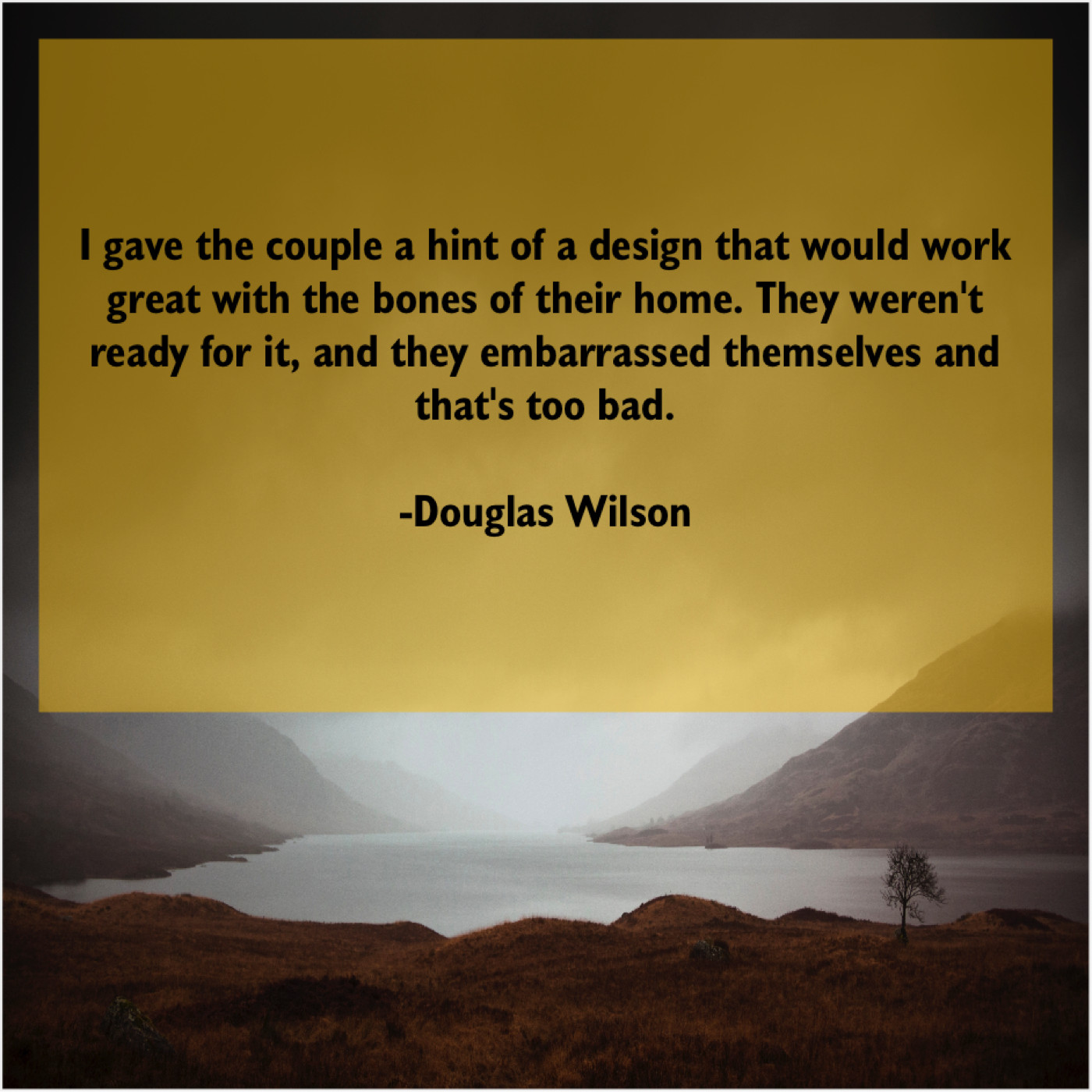 Douglas Wilson Douglas Wilson – I gave the couple a… September 10, 2019 admin “I gave the couple a hint of a design that would work great with the bones of their home. They weren’t ready for it, and they embarrassed themselves and that’s too bad.”-Douglas Wilson