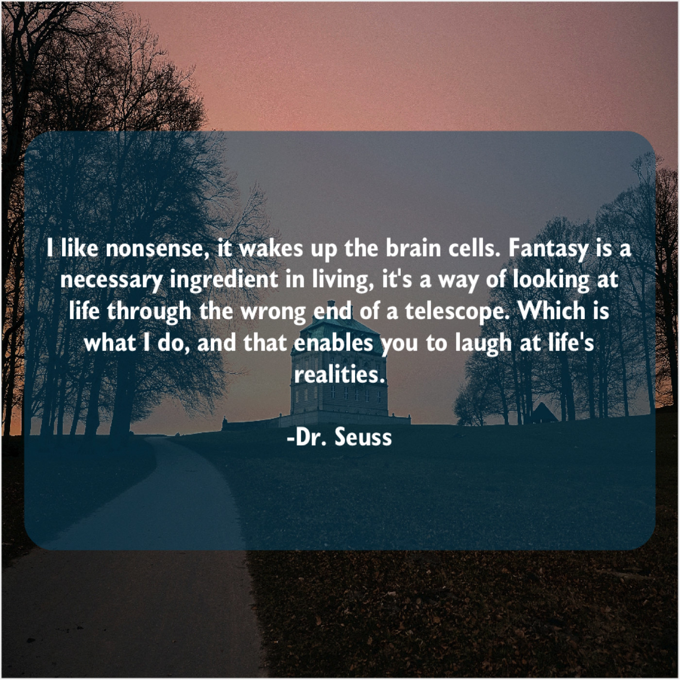 Dr. Seuss Dr. Seuss – I like nonsense, it wakes… December 2, 2018 admin “I like nonsense, it wakes up the brain cells. Fantasy is a necessary ingredient in living, it’s a way of looking at life through the wrong end of a telescope. Which is what I do, and that enables you to laugh at life’s realities.”-Dr. Seuss