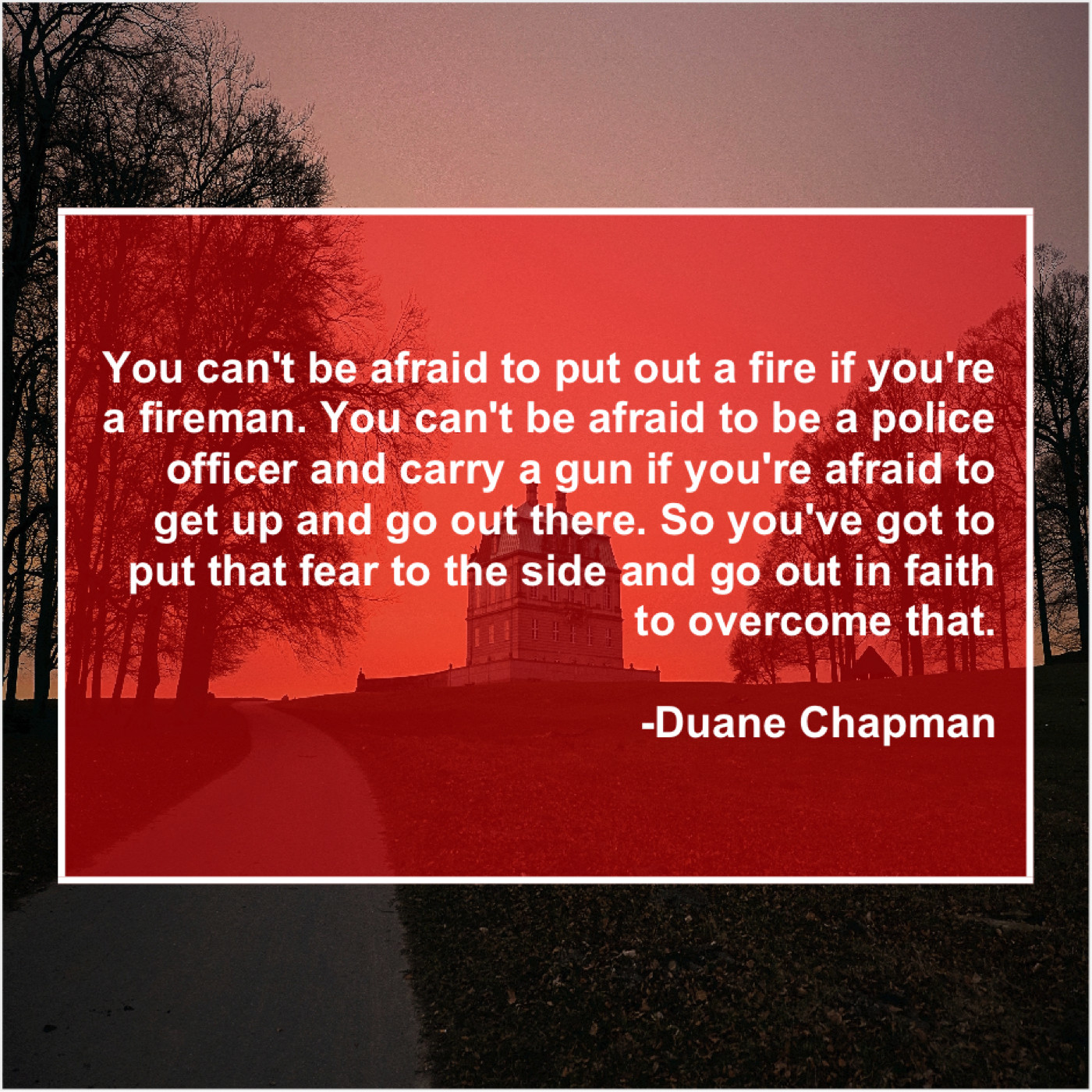 “You can’t be afraid to put out a fire if you’re a fireman. You can’t be afraid to be a police officer and carry a gun if you’re afraid to get up and go out there. So you’ve got to put that fear to the side and go out in faith to overcome that.”