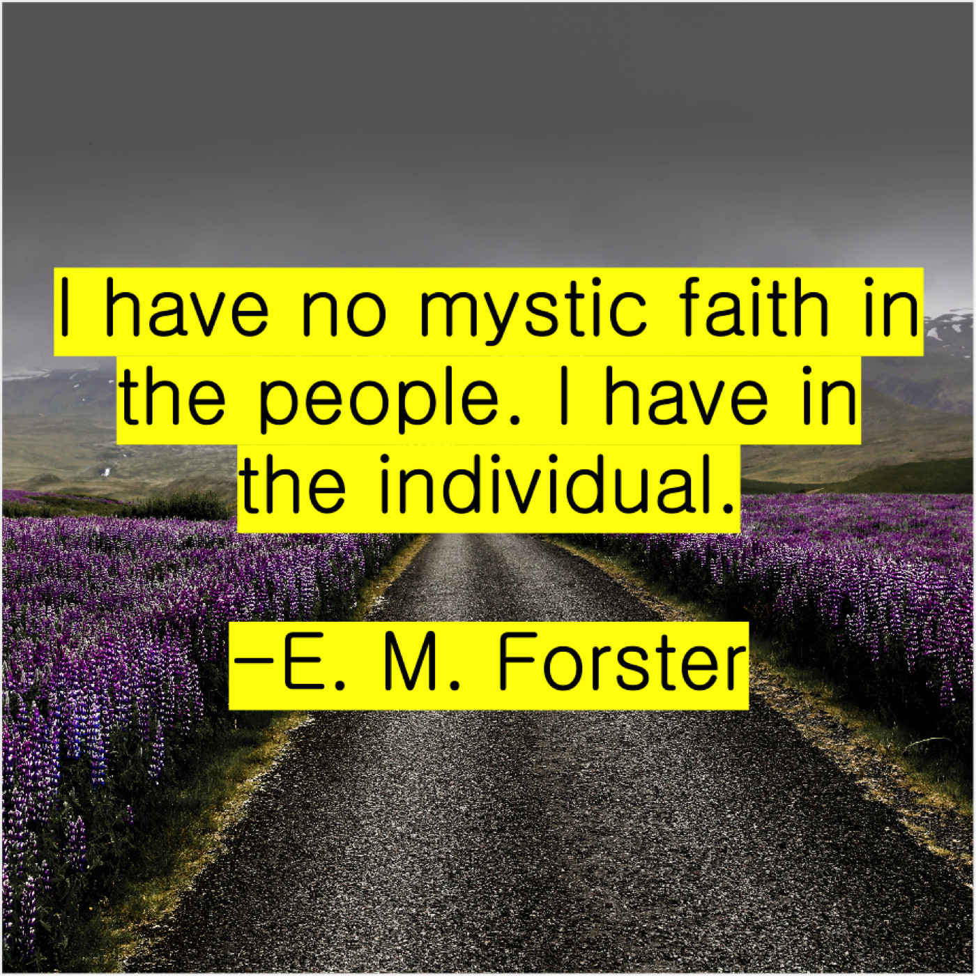 E. M. Forster E. M. Forster – I have no mystic faith… January 31, 2019 admin “I have no mystic faith in the people. I have in the individual.”-E. M. Forster