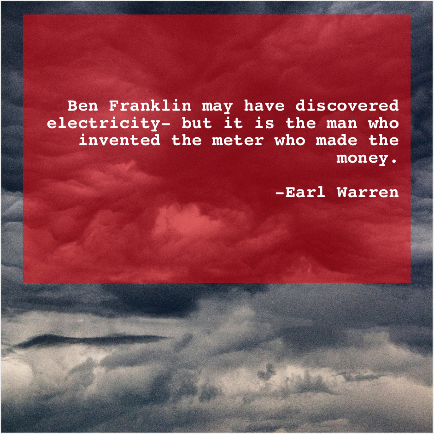 Earl Warren Earl Warren – Ben Franklin may have discovered… January 2, 2019 admin “Ben Franklin may have discovered electricity- but it is the man who invented the meter who made the money.”-Earl Warren