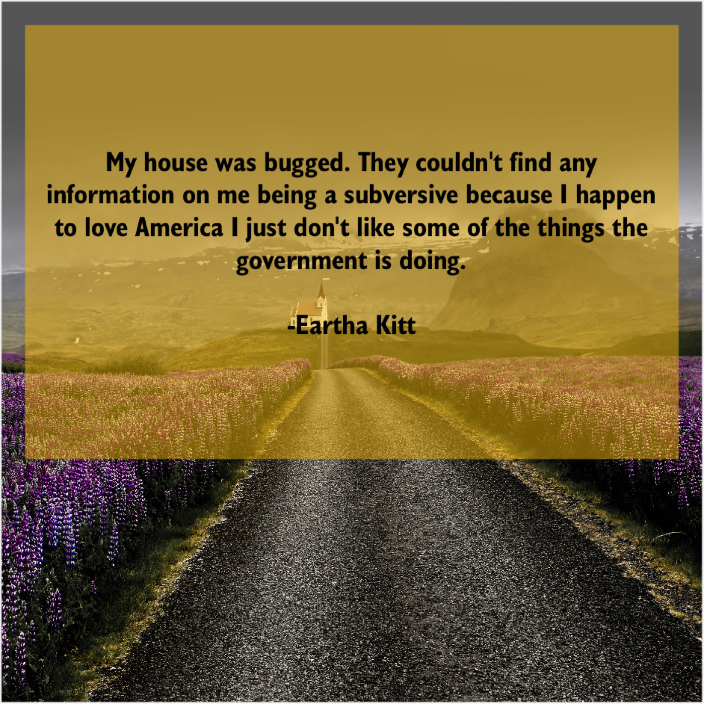 Eartha Kitt Eartha Kitt – My house was bugged. They… December 7, 2018 admin “My house was bugged. They couldn’t find any information on me being a subversive because I happen to love America I just don’t like some of the things the government is doing.”-Eartha Kitt
