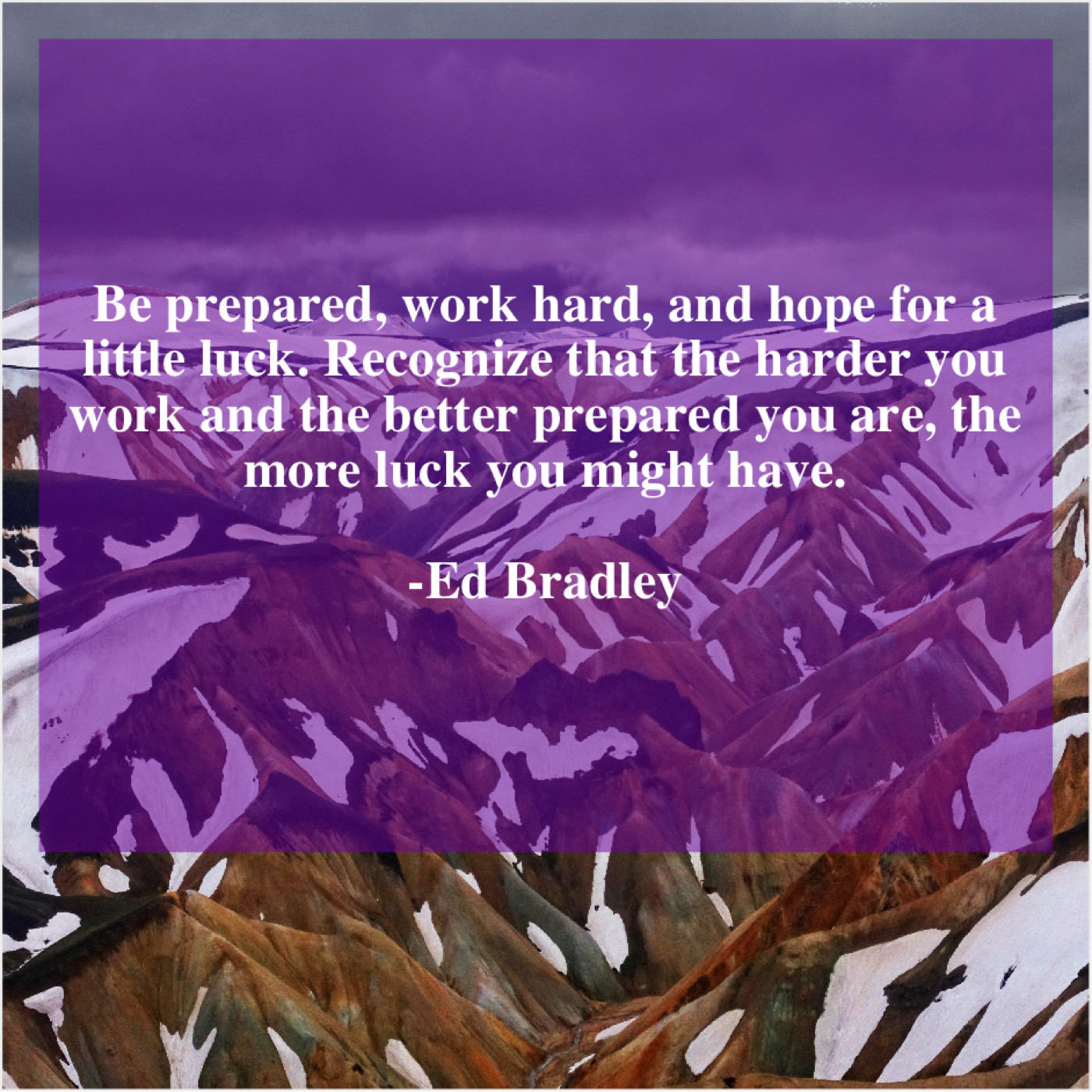 Ed Bradley Ed Bradley – Be prepared, work hard, and… February 17, 2019 admin “Be prepared, work hard, and hope for a little luck. Recognize that the harder you work and the better prepared you are, the more luck you might have.”-Ed Bradley