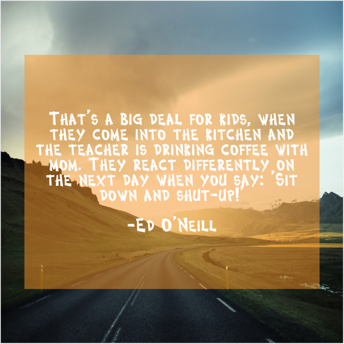 Ed O'Neill Ed O’Neill – That’s a big deal for… May 21, 2019 admin “That’s a big deal for kids, when they come into the kitchen and the teacher is drinking coffee with mom. They react differently on the next day when you say: ‘Sit down and shut-up!'”-Ed O’Neill