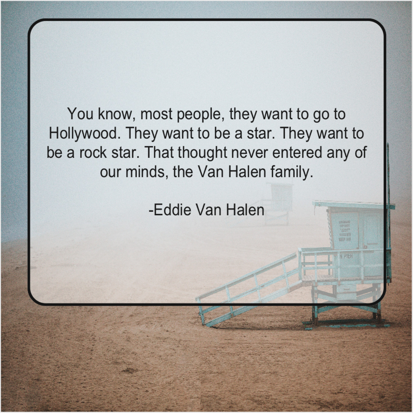 Eddie Van Halen Eddie Van Halen – You know, most people, they… November 8, 2018 admin “You know, most people, they want to go to Hollywood. They want to be a star. They want to be a rock star. That thought never entered any of our minds, the Van Halen family.”-Eddie Van Halen