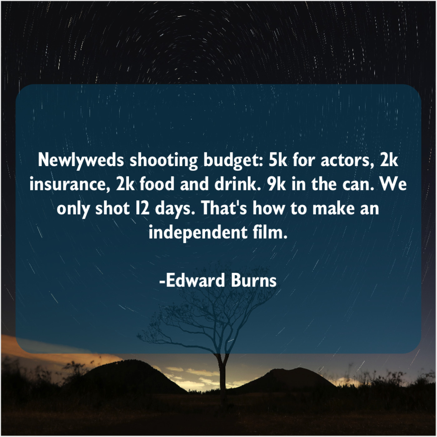 Edward Burns Edward Burns – Newlyweds shooting budget: 5k for… September 5, 2019 admin “Newlyweds shooting budget: 5k for actors, 2k insurance, 2k food and drink. 9k in the can. We only shot 12 days. That’s how to make an independent film.”-Edward Burns