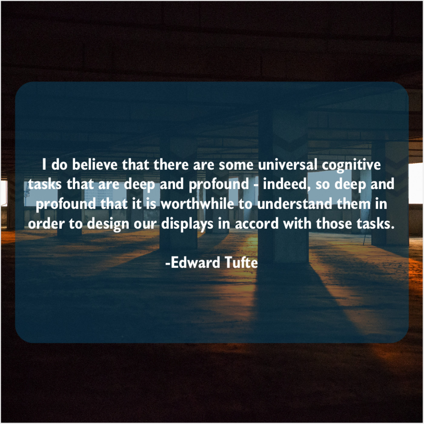 Edward Tufte Edward Tufte – I do believe that there… January 23, 2019 admin “I do believe that there are some universal cognitive tasks that are deep and profound – indeed, so deep and profound that it is worthwhile to understand them in order to design our displays in accord with those tasks.”-Edward Tufte