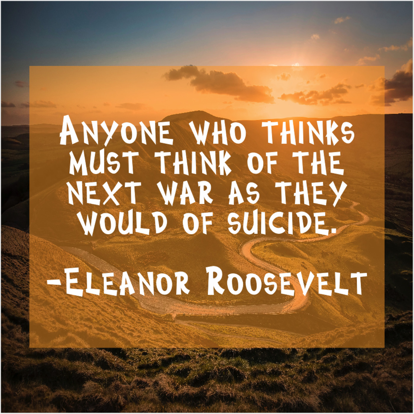 Eleanor Roosevelt Eleanor Roosevelt – Anyone who thinks must think… September 21, 2019 admin “Anyone who thinks must think of the next war as they would of suicide.”-Eleanor Roosevelt