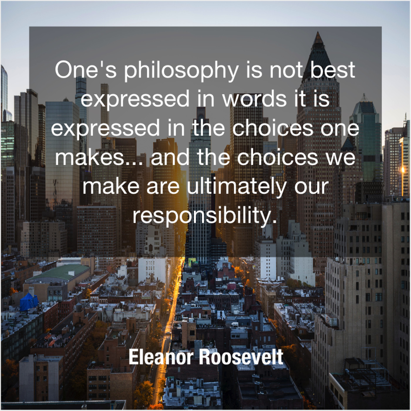 Eleanor Roosevelt Eleanor Roosevelt – One’s philosophy is not best… August 23, 2019 admin “One’s philosophy is not best expressed in words it is expressed in the choices one makes… and the choices we make are ultimately our responsibility.”-Eleanor Roosevelt