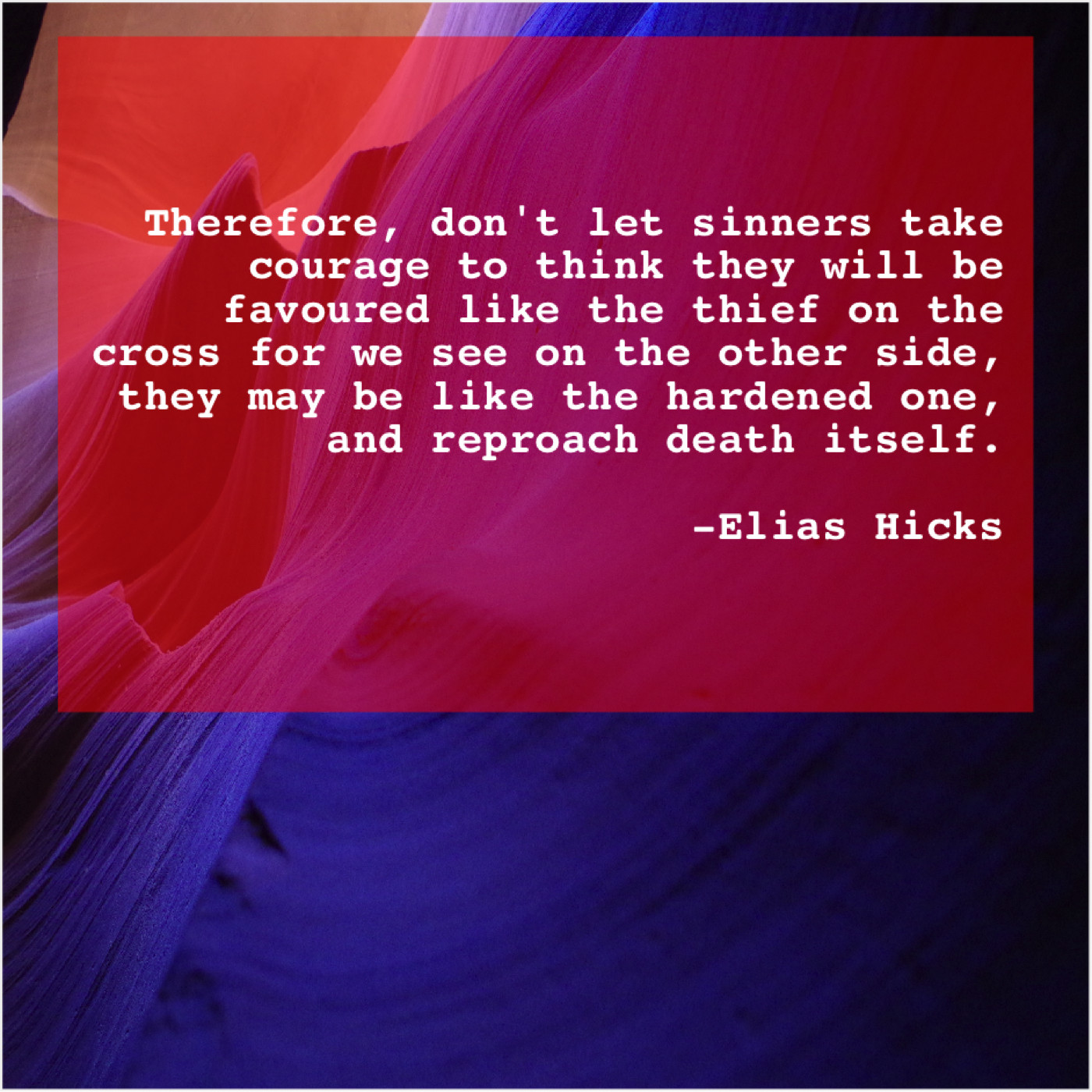 Elias Hicks Elias Hicks – Therefore, don’t let sinners take… August 20, 2019 admin “Therefore, don’t let sinners take courage to think they will be favoured like the thief on the cross for we see on the other side, they may be like the hardened one, and reproach death itself.”-Elias Hicks