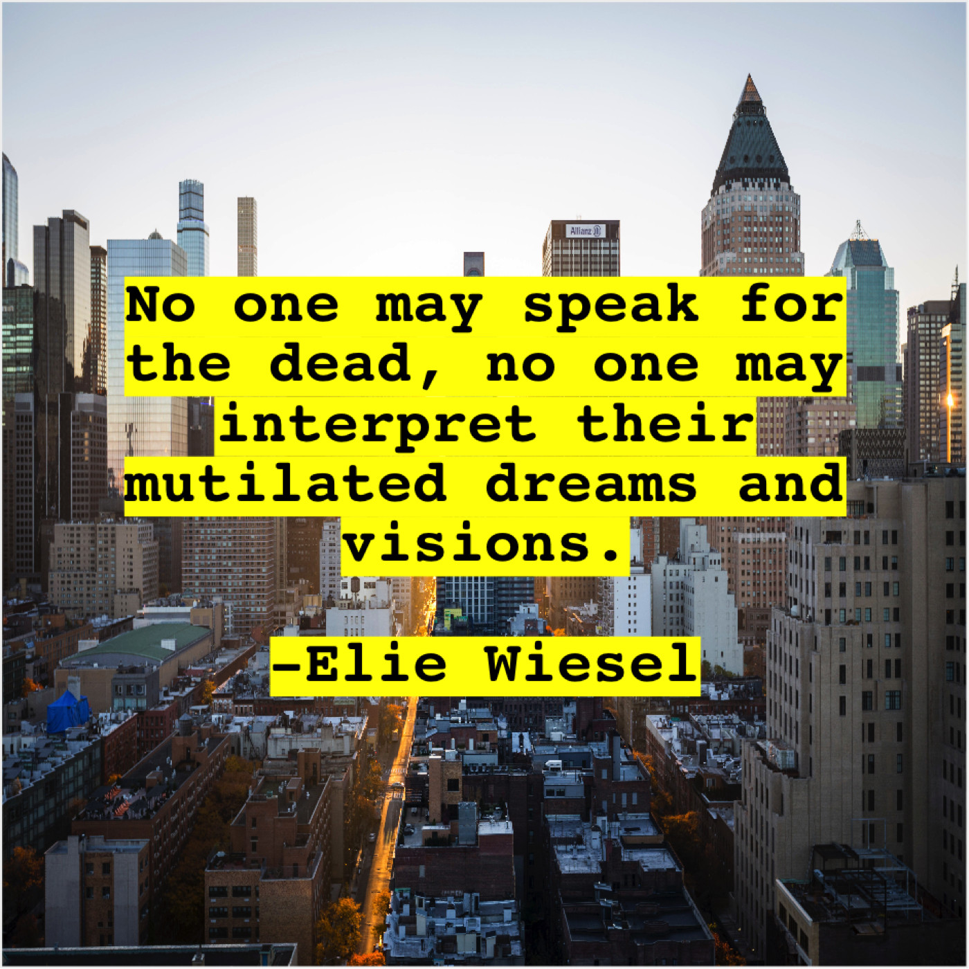 Elie Wiesel Elie Wiesel – No one may speak for… December 18, 2018 admin “No one may speak for the dead, no one may interpret their mutilated dreams and visions.”-Elie Wiesel