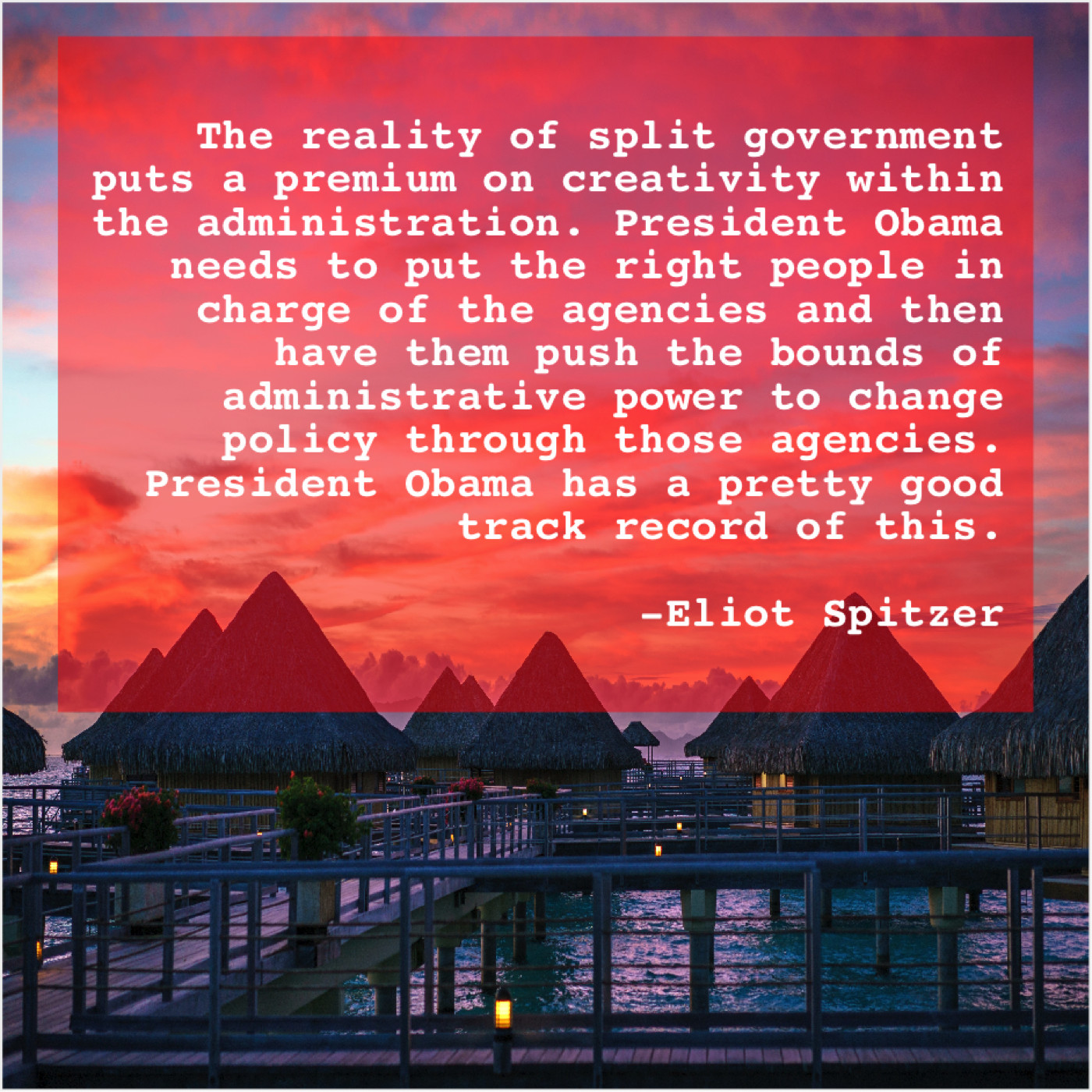 “The reality of split government puts a premium on creativity within the administration. President Obama needs to put the right people in charge of the agencies and then have them push the bounds of administrative power to change policy through those agencies. President Obama has a pretty good track record of this.”